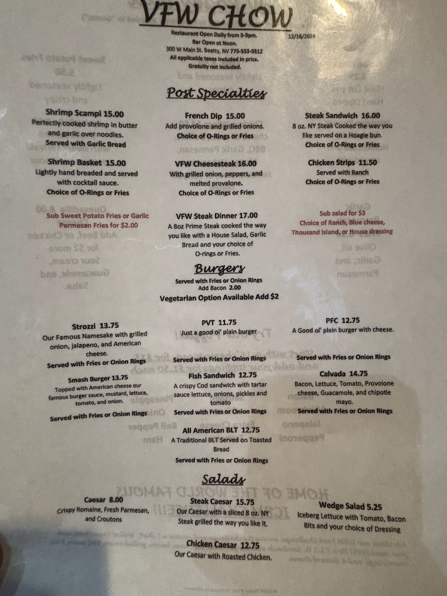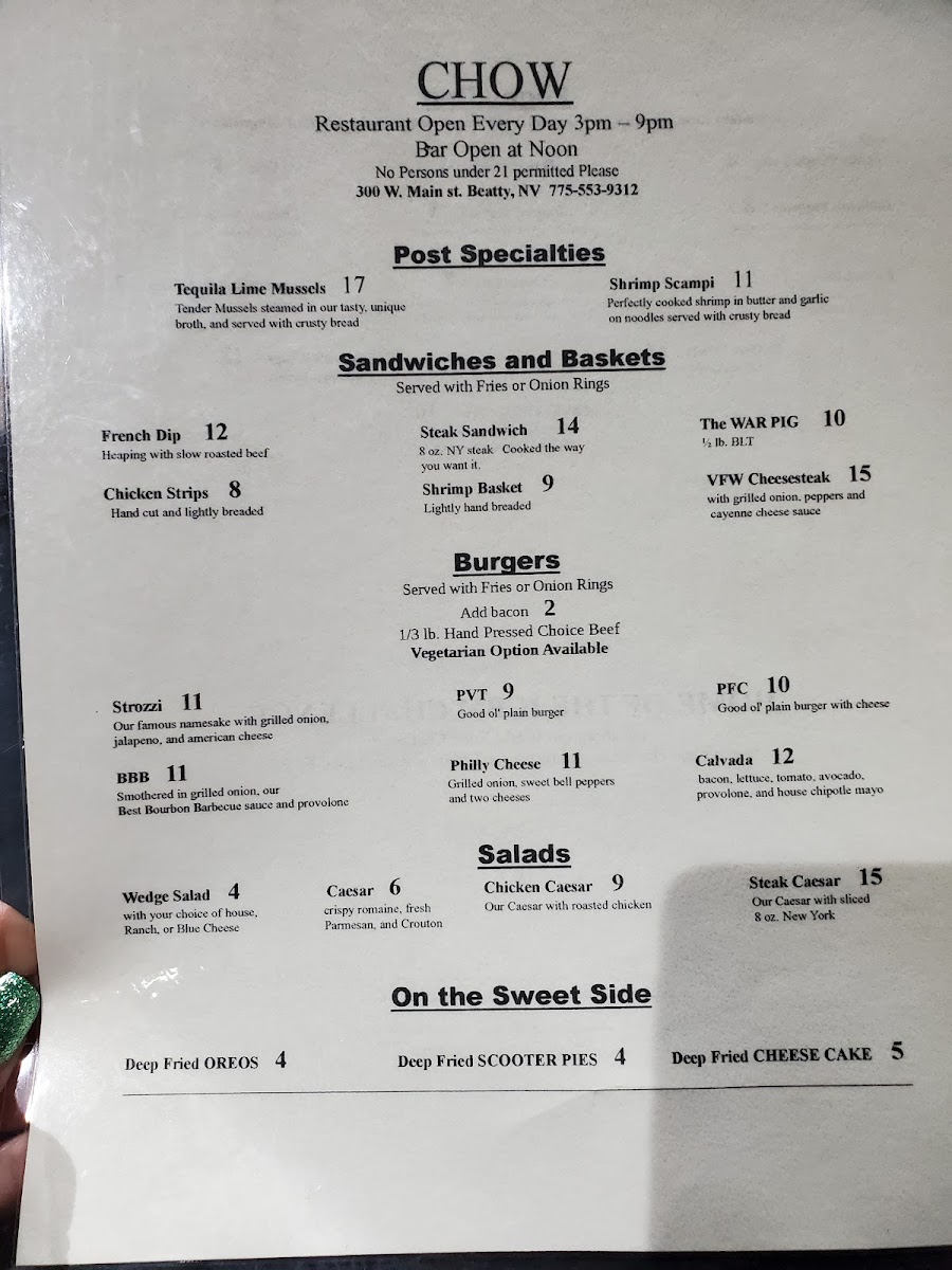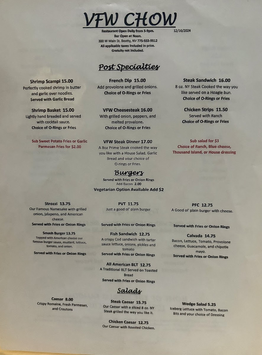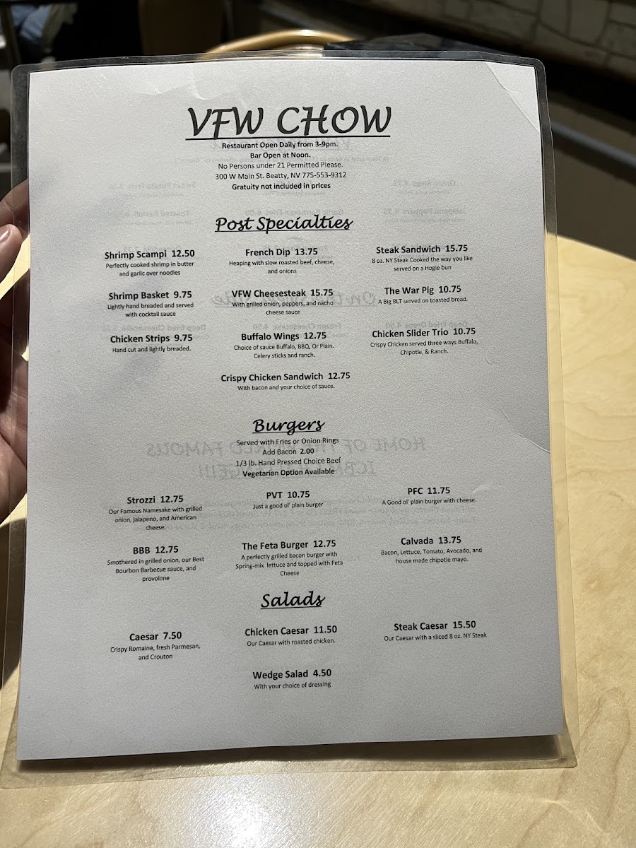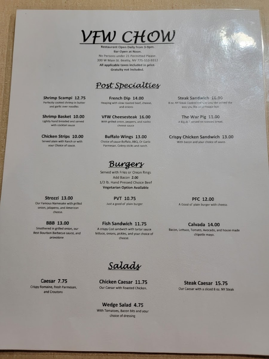 From a reviewer’s perspective, the menu at Vfw Beatty Post offers a straightforward selection of comfort food classics that focus on hearty portions and familiar flavors. The Post Specialties section features satisfying options like Shrimp Scampi, Shrimp Basket, French Dip, Vfw Cheesesteak, and Steak Sandwich, which cater to guests looking for filling, traditional favorites. The burger lineup includes the Strozzi, Smash Burger, Pvt Fish Sandwich, and All American BLT, giving diners a mix of classic American sandwich choices. For lighter options, the salad selection includes Caesar, Steak Caesar, Chicken Caesar, and Wedge Salad, providing simple but reliable alternatives. On the side, guests can choose from shareable snacks and sides such as Onion Rings, Jalapeno Popper Bites, Fries, Chicken Wings, and Sweet Potato Fries, which round out the menu nicely. Overall, the menu focuses on casual, satisfying dishes rather than an extensive or gourmet selection, making it a comfortable spot for classic bar-style meals and familiar favorites.
